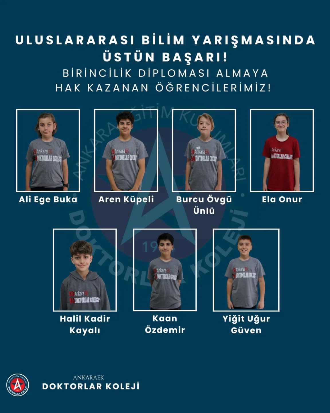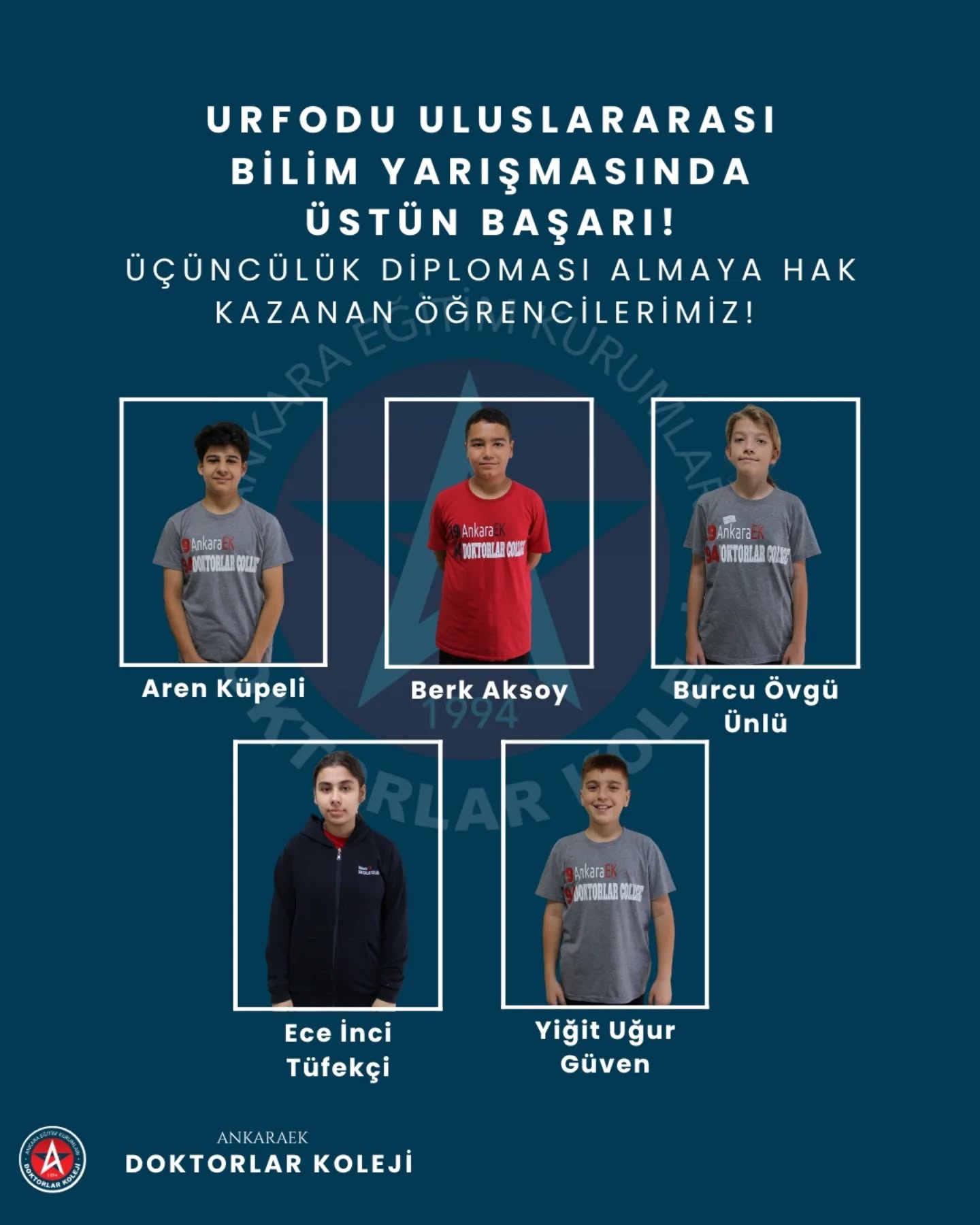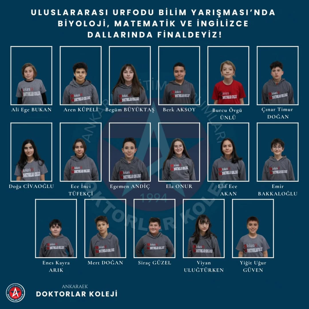 Bu büyük başarıda ülkemizi ve okulumuzu başarıyla temsil eden öğrencilerimiz Azra Yeşil, Ayça Duru, Nilda Ceylin Yiğit, Defne Duvan, Ali Kerem Yeşilkaya, Utku Bakkaloğlu'na sonsuz teşekkürlerimizi sunuyor, Şeref Ödülünü kazanarak bize bu gururu yaşatan öğrencimiz Defne Duvan'ı tebrik ediyoruz!